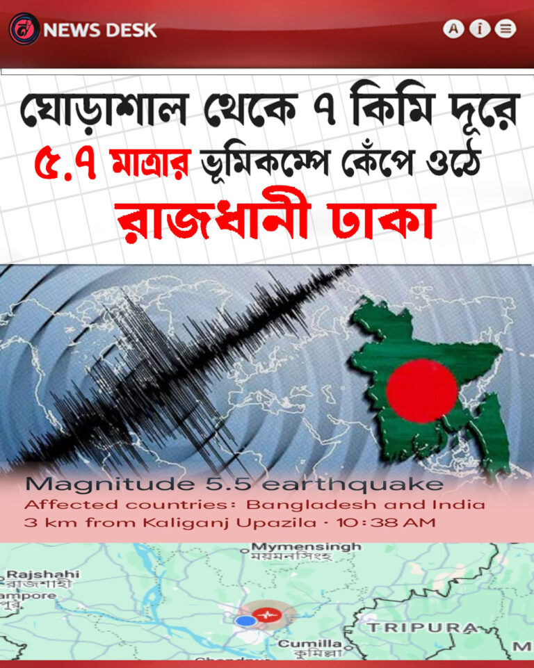 ঘোড়াশাল এলাকার নিকটস্থ অঞ্চলে রিখটার স্কেলে ৫.৭ মাত্রার একটি ভূমিকম্প আঘাত হানে। ভূমিকম্পটির উৎপত্তিস্থল ছিল ঘোড়াশাল থেকে প্রায় ৭ কিলোমিটার...