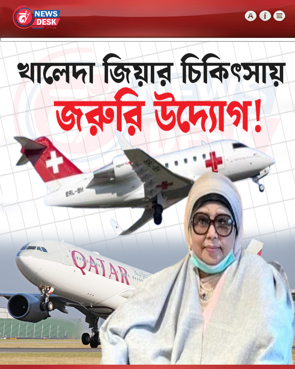 জানা গেছে, কাতার সরকার খালেদা জিয়ার চিকিৎসার বিষয়টি বিবেচনায় এনে পূর্বের পরিকল্পনা পরিবর্তন করে নতুন এয়ার অ্যাম্বুল্যান্সের ব্যবস্থা করেছে। এ উদ্দেশ্যে এফএআই অ্যাভিয়েশন গ্রুপ থেকে একটি বোম্বার্ডিয়ার চ্যালেঞ্জার ৬০৪ (CL60) মডেলের মেডিক্যাল ইভাকুয়েশন এয়ারক্রাফট ভাড়া করা হয়েছে।