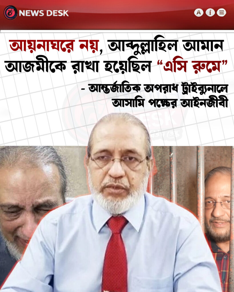 আজ আসামিপক্ষের আইনজীবীরা আন্তর্জাতিক অপরাধ ট্রাইব্যুনাল-১-কে জানিয়েছেন যে, জামায়াতে ইসলামীর সাবেক আমীর গোলাম আযমের ছেলে ব্রিগেডিয়ার জেনারেল (অব.) আব্দুল্লাহিল আমান আজমীকে যৌথ জিজ্ঞাসাবাদ কেন্দ্রের (JIC) কুখ্যাত ‘আয়নাঘরে’ রাখা হয়নি, বরং তাকে একটি আলাদা শীতাতপ নিয়ন্ত্রিত (এসি) কক্ষে রাখা হয়েছিল।